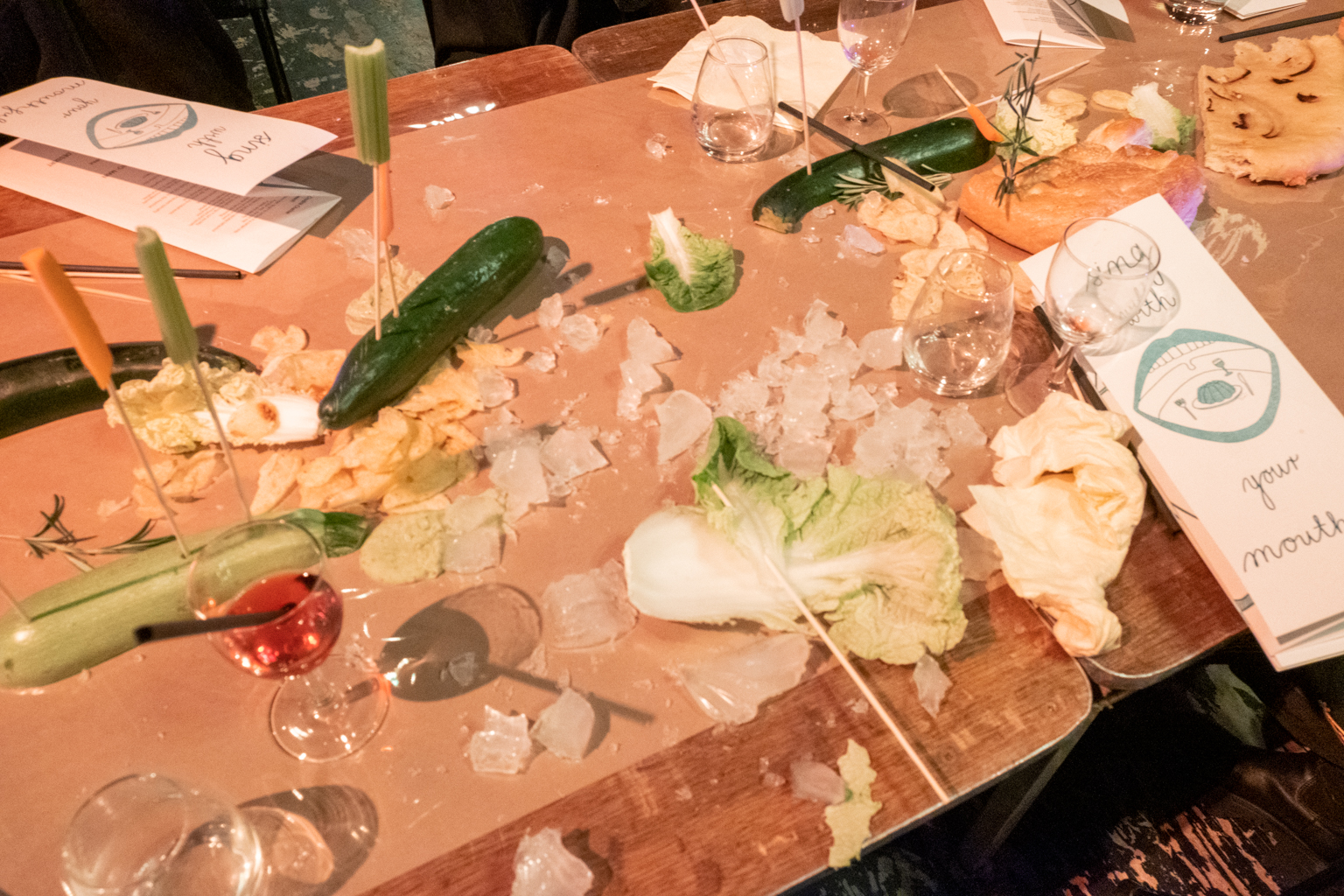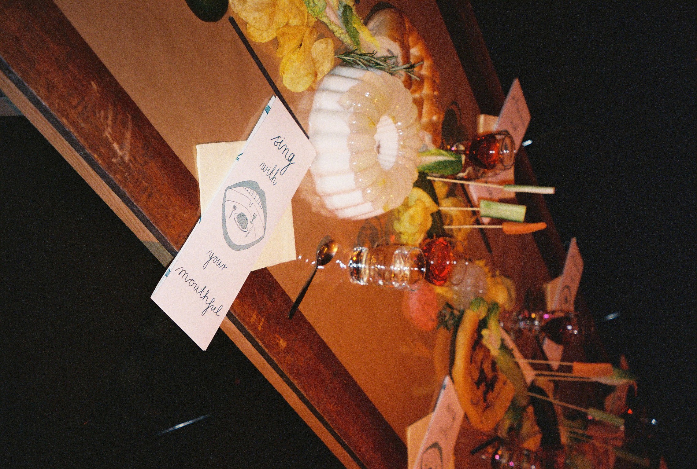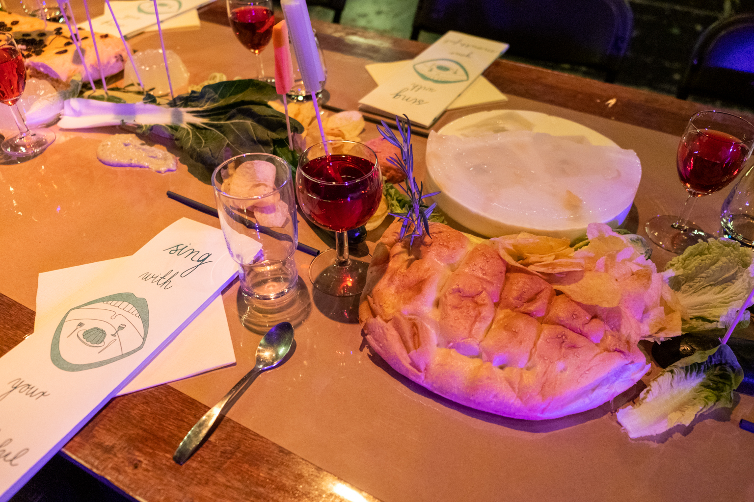 Sing With Your Mouthful is a performative banquet where food and vocal composition merge. The audience was guest, witness and participant in the experimental happening. As the dinner progressed, everything became messy both physically and sonically. There was gargling, singing with a mouthful of food, bubbles blown into the "wine," and conversations continued in shouts from one end of the table to the other. Dining conventions and etiquette were questioned, and the audience was invited to join in on everything.